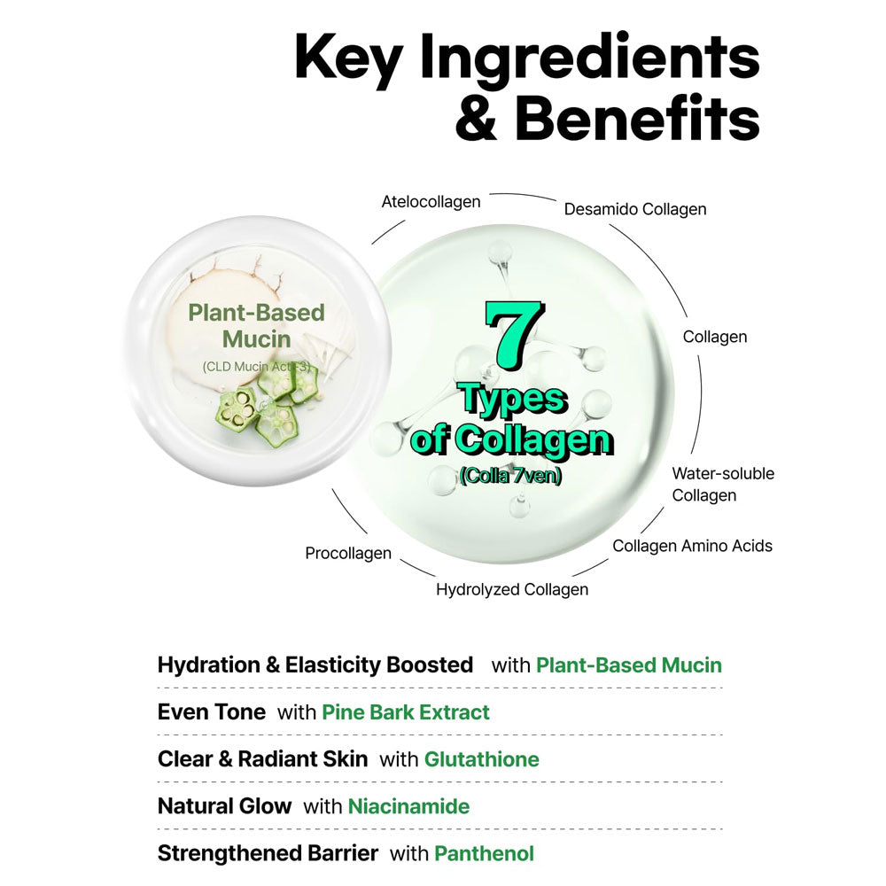 Firms and lifts skin with 7 types of collagen + 3 types of mucin