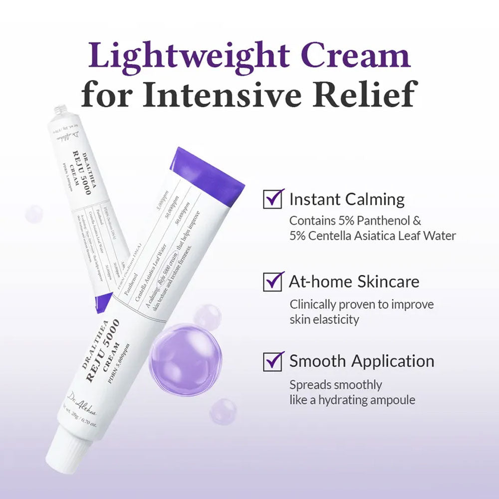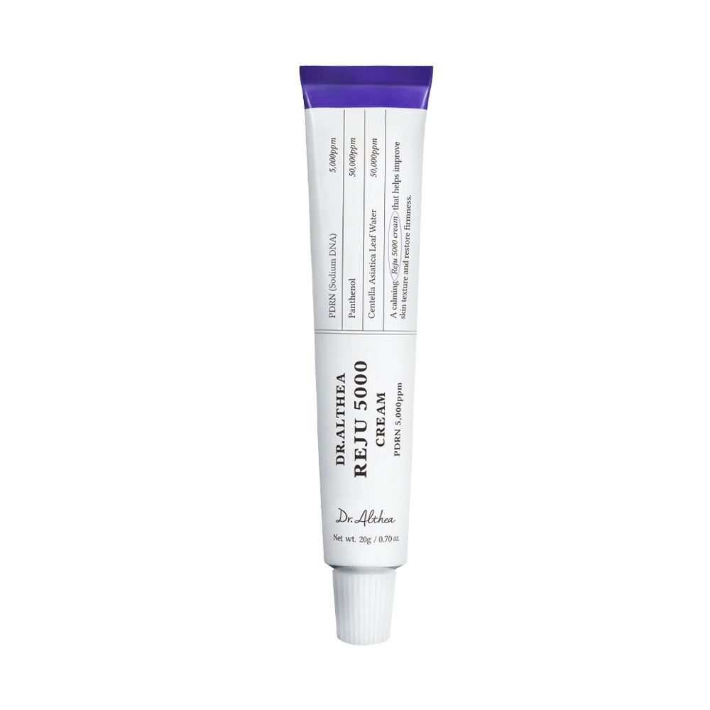 Dr. Althea Reju 5000 Cream is a deeply soothing, barrier-repairing Korean moisturizer designed for sensitive, irritated, or overworked skin. Infused with vegan PDRN, Centella Asiatica, EGF, and a Triple Hyaluronic Acid Complex, this lightweight gel-cream quickly absorbs without greasiness leaving your skin calm, hydrated, and comfortably refreshed.
