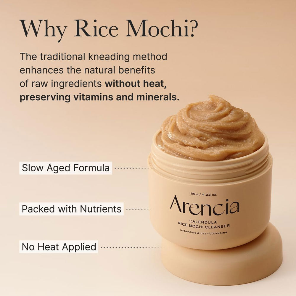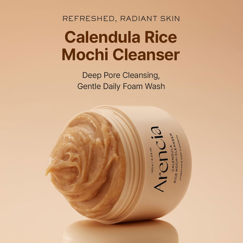 The Arencia Calendula Rice Mochi Cleanser 120g is a unique all-in-one facial cleanser designed to deeply cleanse while nourishing and calming sensitive skin. Crafted through a traditional kneading process, this cleanser features a soft, elastic mochi-like texture that delivers gentle yet effective cleansing without stripping the skin.