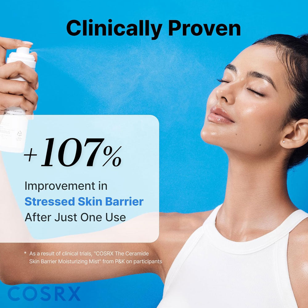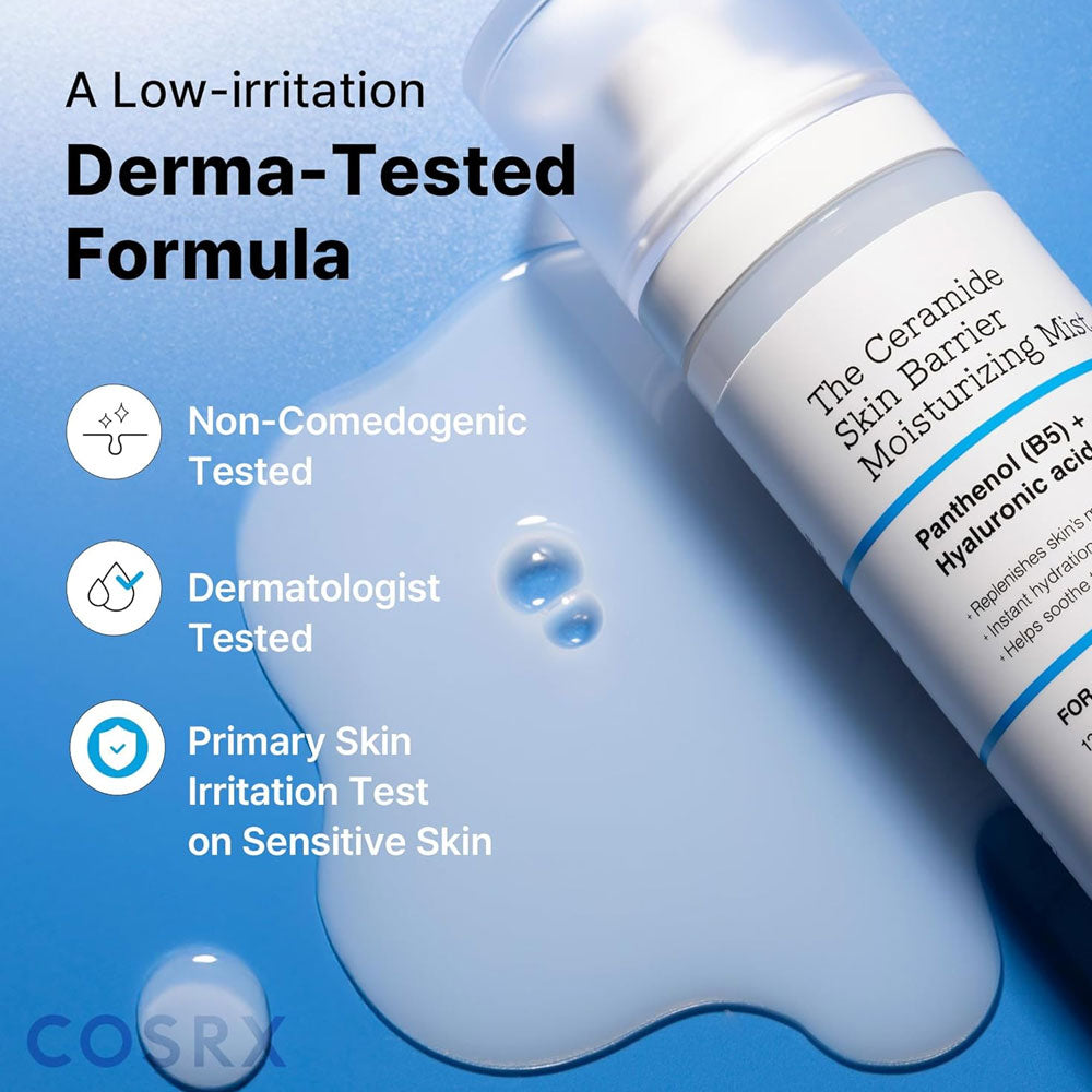 The COSRX The Ceramide Skin Barrier Moisturizing Mist is a fragrance-free, non-comedogenic face mist designed to hydrate, soothe, and strengthen the skin barrier in one simple step. Powered by ceramides, cholesterol, fatty acids, and five types of hyaluronic acid, this mist delivers deep moisture while helping repair a damaged skin barrier.