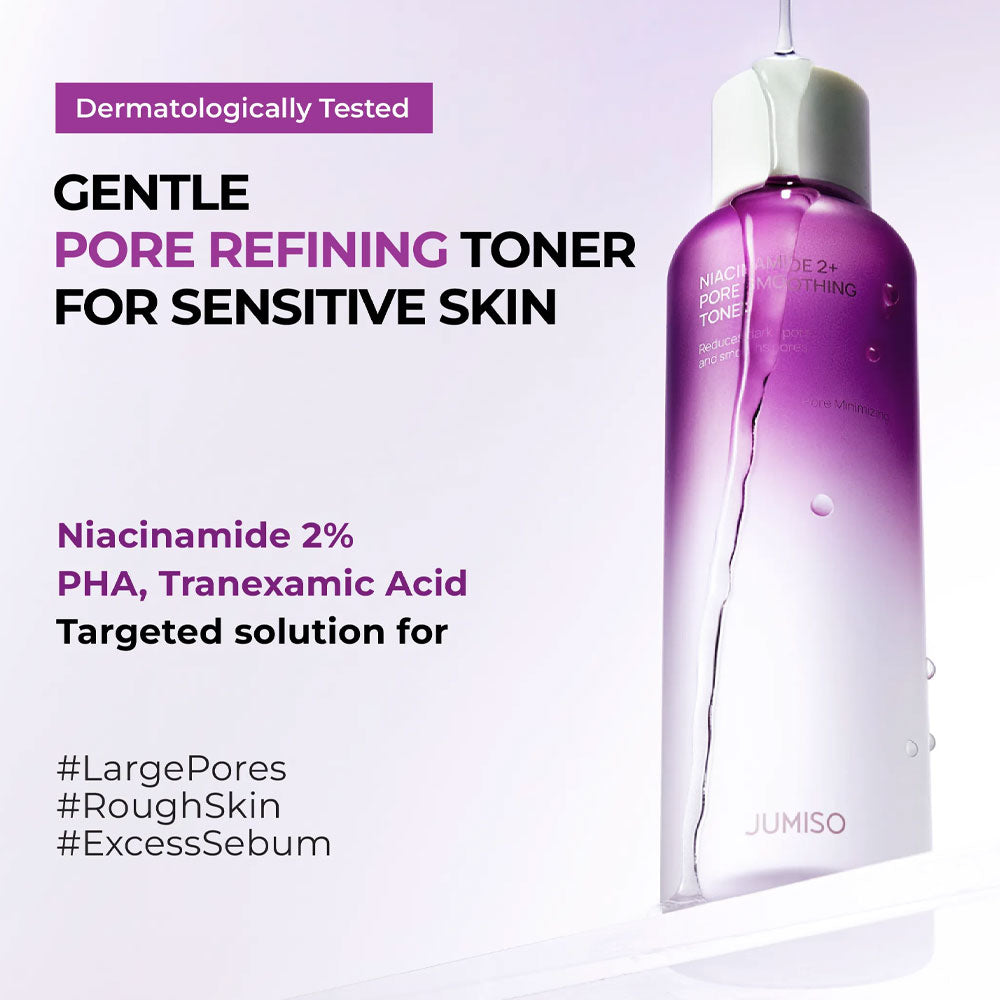 The JUMISO Niacinamide 2+ Pore Smoothing Toner is a gentle yet effective daily toner designed to balance oil-water levels, refine pores, and smooth skin texture. Formulated with Niacinamide, BHA, and PHA, it helps remove excess sebum and impurities while mildly exfoliating to unclog pores and improve skin clarity.