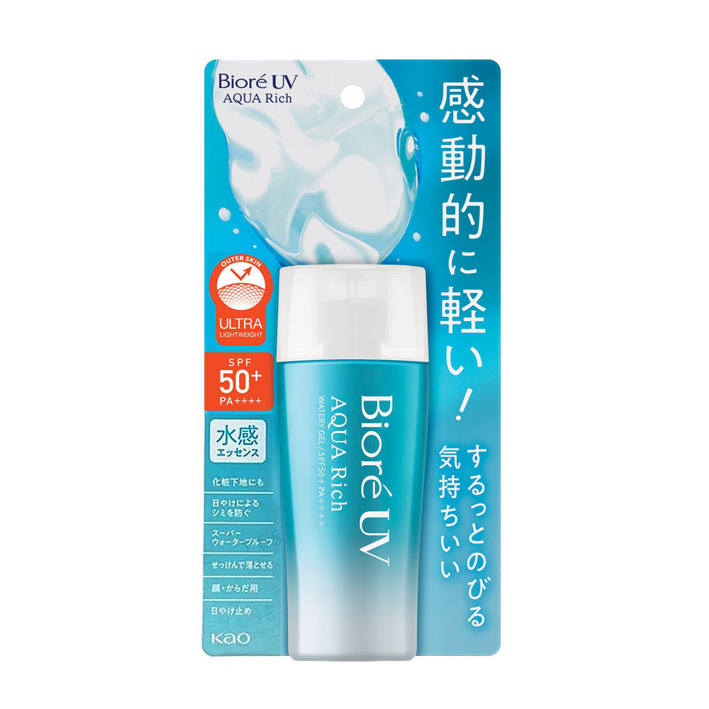 Kao Biore UV Aqua Rich Watery Gel SPF 50+ PA++++ is a cult-favorite Japanese sunscreen known for its ultra-light, water-based texture and high broad-spectrum UV protection. Powered by Biore’s Micro Defense UV Technology, this sunscreen spreads evenly at a microscopic level, helping prevent sun damage, dark spots, and freckles caused by UV exposure.