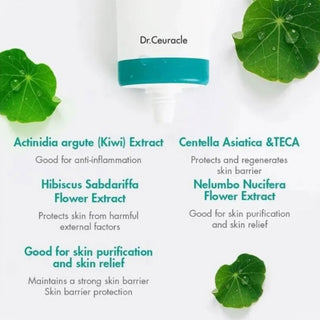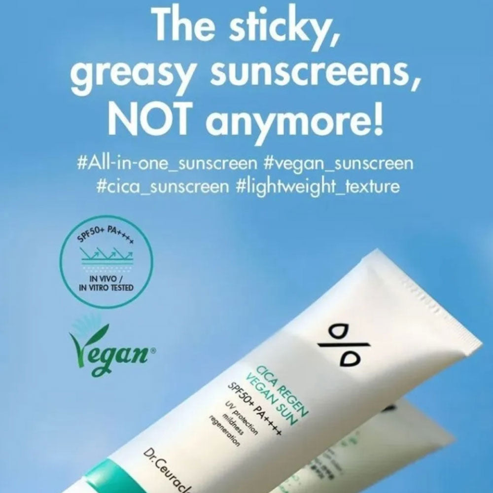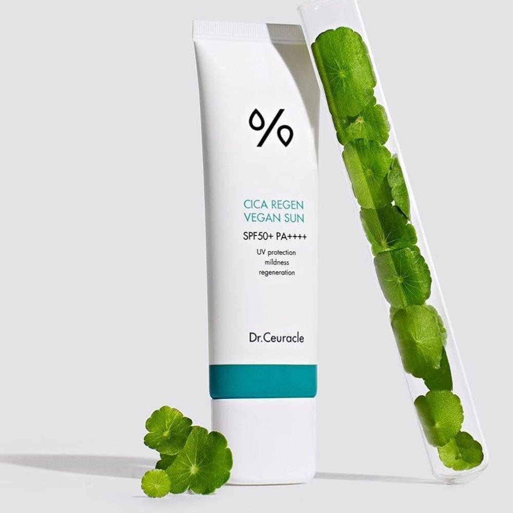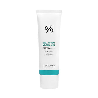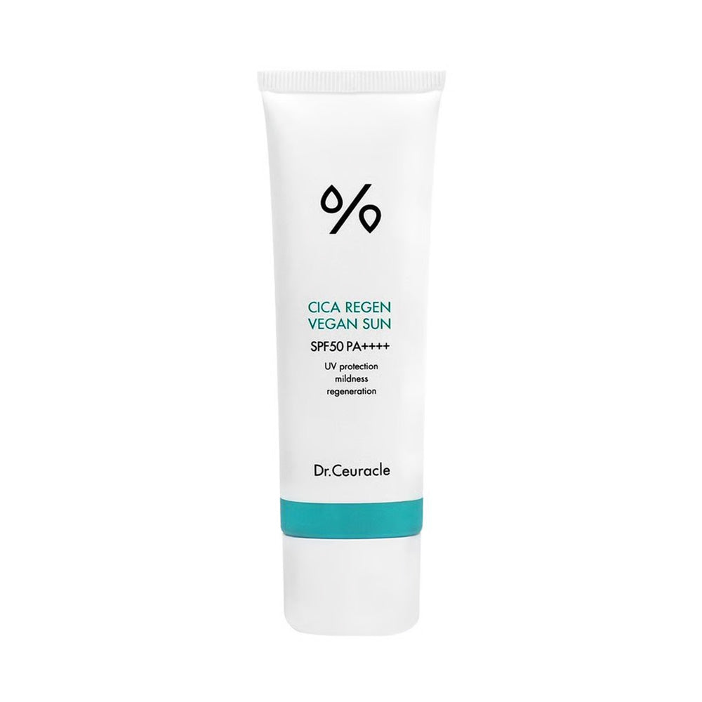 Dr. Ceuracle Cica Regen Vegan Sun SPF50+ PA++++ is a dermatologist-tested, vegan-certified chemical sunscreen designed to offer broad-spectrum UV protection while soothing, hydrating, and strengthening the skin. Ideal for sensitive, oily, combination, or acne-prone skin, this lightweight sunscreen delivers a matte, non-sticky finish perfect for daily wear.