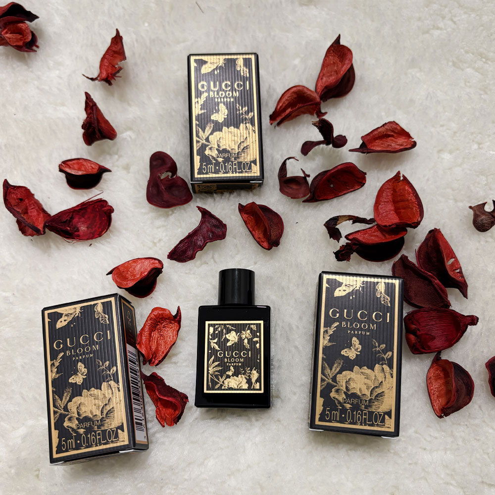 Housed in a striking midnight black bottle with Gucci’s signature floral print, this 5ml version is perfect for travel, trial, or gifting.