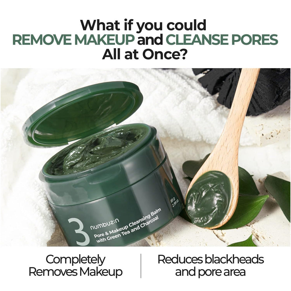 The Numbuzin No.3 Pore & Makeup Cleansing Balm (85g) is a multifunctional cleansing balm that melts away heavy makeup and impurities without drying out the skin. Infused with green tea powder, green tea seed oil, and green tea extract, it delivers antioxidant-rich hydration while charcoal powder deeply cleanses pores and absorbs excess sebum.